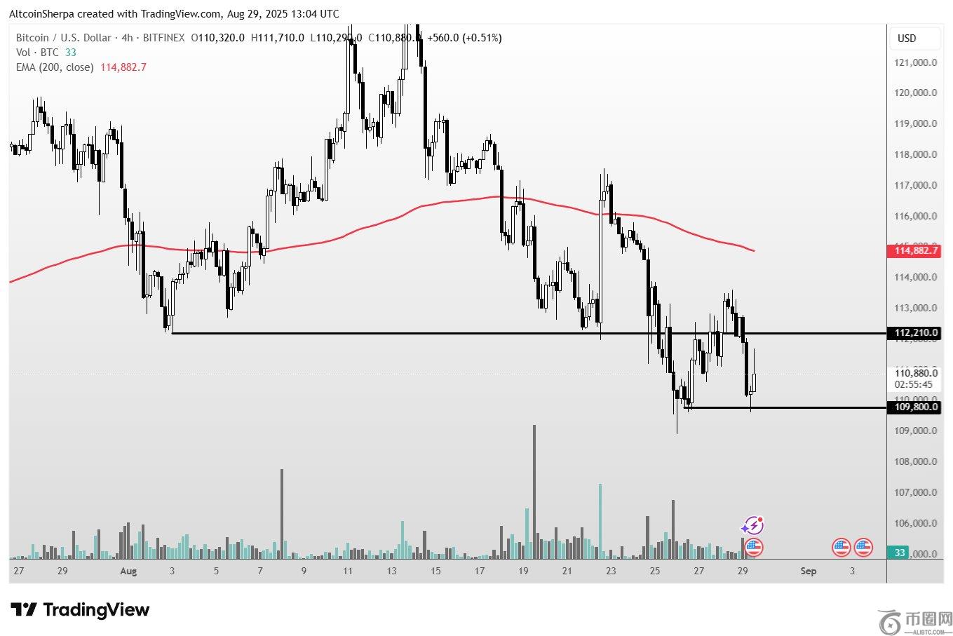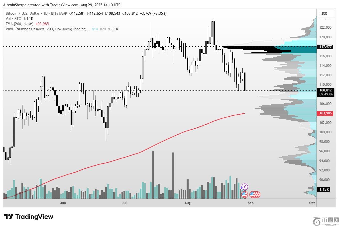 根据 Sherpa 的数据,按市值计算,排名前 10 的加密资产浸渍低于111,800美元的价格表明其将继续下跌。本周早些时候,他预测BTC 跌破该范围将预示着短期困境。