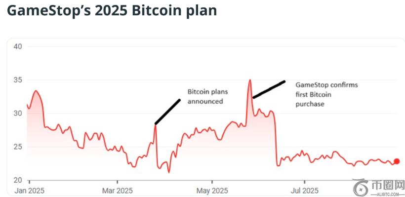 GameStop 的命运长期以来与比特币和加密货币交织在一起。2021 年,Reddit上的r/WallStreetBets 子版块散户交易者引发了GameStop 股票轧空,将Meme金融推向了主流。2025年3月26日,GameStop宣布计划投资比特币,随后其股价上涨了12% ,紧接着在5月28日披露已买入4710枚比特币后,股价更是一度飙升至每股35美元的峰值。