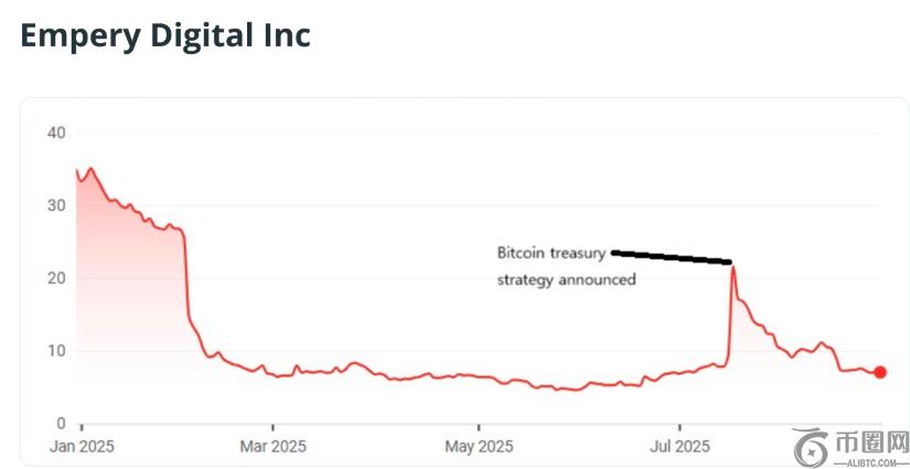 在此次调整之前,Empery Digital的股价大多在 6 美元至 7 美元之间,远低于 1 月份 35 美元的高点。7 月 17 日宣布比特币财库战略后一度将股价推高至 21 美元,但涨势并未持续,本周再次回落到7美元的正常区间。
