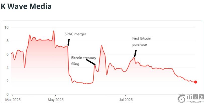 韩国娱乐公司 K Wave Media 于 2025 年 7 月**购买比特币,但此后股价一直在下滑,该公司已筹集 10 亿美元用于收购比特币,但股价仍面临压力。