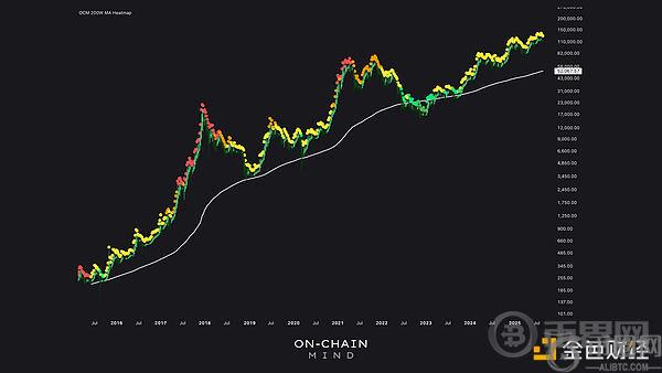 可视化图表:200 周移动平均线(MA)在比特币的价格走势下方呈现出一条**的、向上倾斜的曲线。