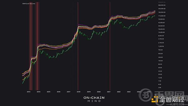 我的一个综合指标被称为“周期顶部线”,它整合了 6 个不同的链上指标,这些指标在历史上都曾标记出比特币的狂热峰值。虽然没有模型是**的,但它们的合并平均值表明,此轮周期的顶部可能在约 211, 000 美元左右。