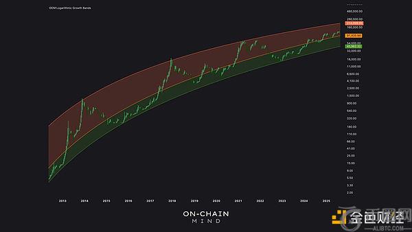 比特币的高波动性使得传统线性图表难以捕捉其长期趋势。通过使用对数标度和“对数增长带”,我们可以更清晰地观察比特币的增长模式。