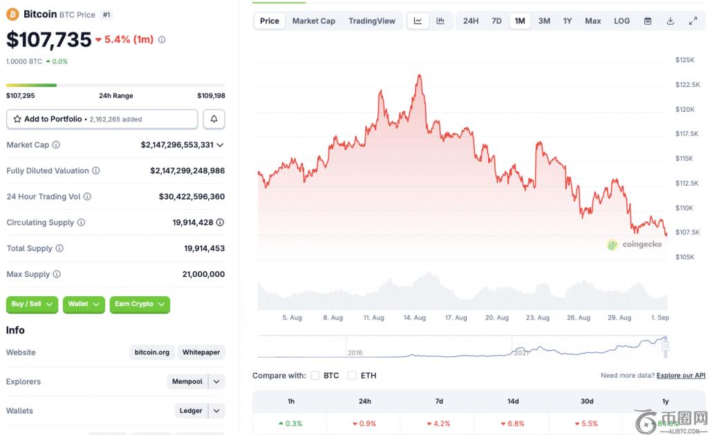 进入九月份,加密货币市场继续呈下行趋势。CoinCodex 的统计数据显示,比特币 (BTC) 价格已跌至 107,000 美元水平,此前在 8 月 14 日创下 124,128 美元的历史新高。BTC 的价格在日线图上下跌了 0.9%,在周线图上下跌了 4.2%,在 14 天线图上下跌了 6.8%,与上个月相比下跌了 5.5%。