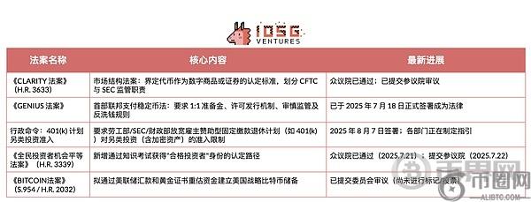 对投资者而言,当前需**关注以下进展:《GENIUS 法案》已正式生效,为支付型稳定币确立了基础监管框架;众议院通过的《CLARITY 法案》将明确界定**由美国商品期货交易委员会(CFTC)或证券交易委员会(SEC)管辖的标准;行政命令正推动监管机构开放 401(k) 计划对加密资产的投资渠道;而众议院通过的合格投资者考试改革方案,有望扩大私募加密交易参与者的准入范围。