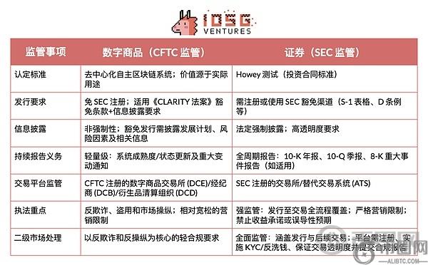 下表概括了数字商品(CFTC 管辖)与证券(SEC 管辖)在实际监管中的核心区别。CLARITY 法案框架基本延续现有监管分工,但为资产从 SEC 管辖向 CFTC 转移提供了明确路径——一旦底层链满足上述成熟性标准,相关数字商品即可转入 CFTC 监管体系。