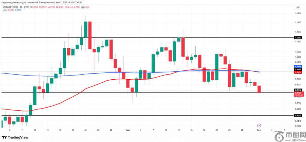 ONDO目前交易价为 0.872 美元,在指数移动平均线上形成死亡交叉。即使考虑到这一技术弱点,9 月份的加密货币事件也包括 ONDO 定于 9 月 3 日发布的重大公告。