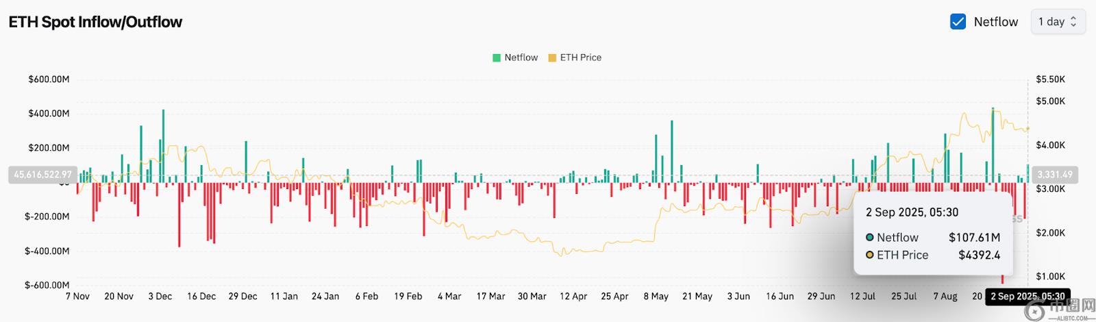 链上资金流动凸显了看涨的暗流。现货交易所数据显示,9 月 2 日净流入 1.076 亿美元,是近几个月来增持**劲的一天之一。存款激增的同时,价格稳定在 4,390 美元附近,这表明鲸鱼正在为潜在的上涨做准备。