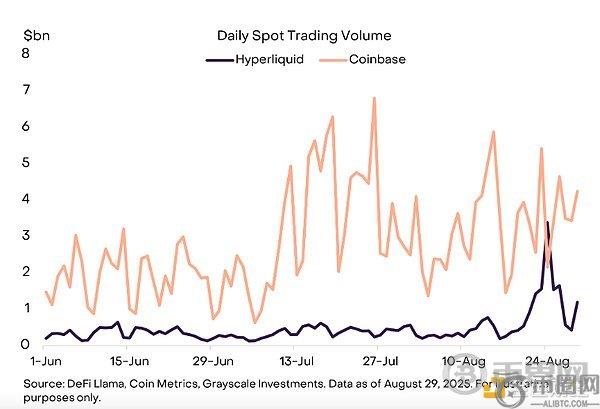 这出大戏的一部分发生在 Hyperliquid 上,这是一家去**化交易所 (DEX),提供现货交易和永续合约交易(请参阅《DEX 的崛起》https://www.jinse.cn/blockchain/3716302.html)。从 8 月 20 日开始,一位比特币“鲸鱼”(大持有者)出售了约 35 亿美元的 BTC,并立即买入了约 34 亿美元的 ETH。虽然我们无法判断投资者的动机,但看到如此规模的风险转移发生在 DEX 而不是**化交易所 (CEX) 上,还是令人鼓舞的。事实上,在本月交易量**的一天,Hyperliquid 的现货交易量一度高于 Coinbase 的现货交易量(图表 3)。