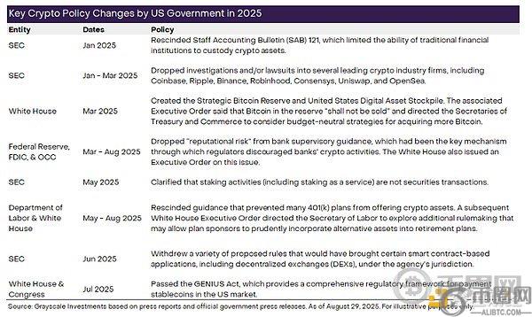 然而,美国今年的政策变化远不止稳定币,涵盖了从加密资产托管到银行监管指引等一系列问题。图表 2 总结了我们认为特朗普政府和联邦机构今年在数字资产方面最重要的具体政策行动。这些政策变化——以及未来更多政策变化——**了整个加密行业的机构投资浪潮(更多详情请参阅《机构连锁反应》)。