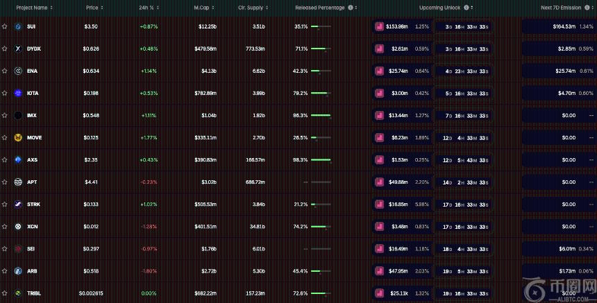 - –SUI和Jupiter(JUP):解锁规模合计超 6.2 亿美元,其中 SUI 约 4400 万枚(1.59 亿美元)、JUP 约 5350 万枚(2700 万美元)。