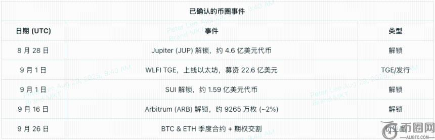 - 4. **解锁潮:Arbitrum、SUI、Jupiter等项目将在 9 月释放超过 10 亿美元的**,短期可能带来抛压。