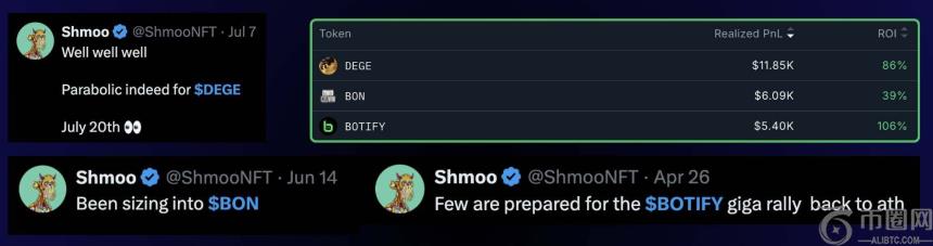 但钱包追踪显示,他**的几笔盈利交易如$DEGE、$BON、$BOTIFY全都在X上推广过,也出现在ZachXBT的爆料名单中。