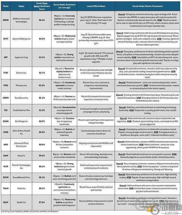 研究机构Vanda Research的一项分析发现,BMNR不仅在韩国受到追捧,在美国投资者中也获得了**关注。其投资者情绪得分高达98.4%,超过了名单上的所有其他股票。这表明,追逐高波动性、高动能资产的偏好,在全球散户中具有**的共性。