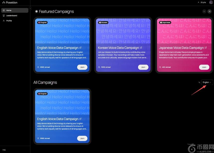 STEP 3. 选择可沟通的语言进行参与任务,完成指定录音任务后提交任务(能张口说即可,无需特别流畅),获得积分(如下图所示,完成一次任务可获得 10 点积分),每天可完成五次。