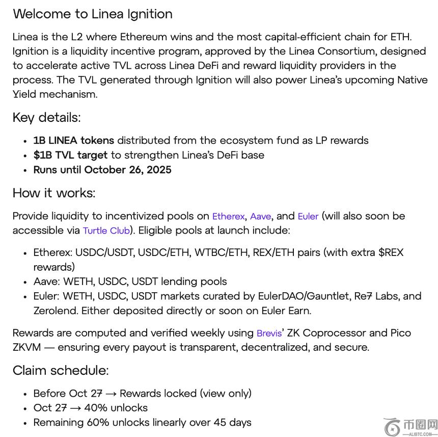 昨日晚间,Linea 官方宣布将启动流动性激励计划 Linea Ignition,计划分发 10 亿 LINEA **作为激励,以为 Linea 额外吸引 10 亿美元 TVL。