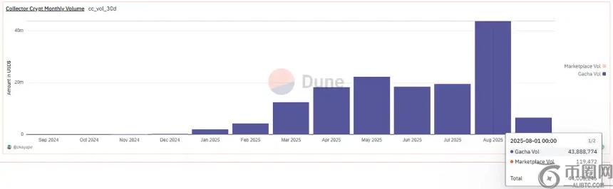 此外,市场上还有 Beezie、Drip、Emporium 和 phygitals 等类似项目。然而,Collector Crypt 是**发行**的平台,因此占得先机。数据显示,Collector Crypt 上个月的月交易量达到约 4,400 万美元,与 Courtyard 接近。