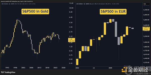 此外,黄金或通胀调整后,美国股市今年迄今仍处于负值状态。参见下图。左侧为黄金经调整后的数据,右侧为以欧元计价的相同标普500指数。