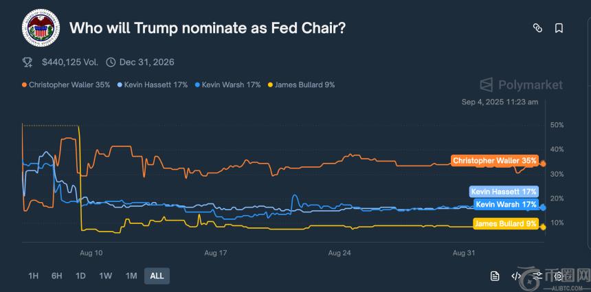 截至**数据,Polymarket 显示 Waller 仍以 35%的概率领跑,高于其他热门对手 Kevin Hassett 和 Kevin Warsh 的 17%。