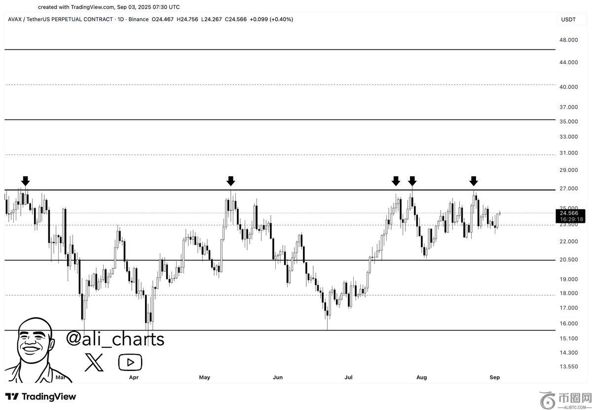 “27 美元是 Avalanche 的关键阻力位。突破该阻力位,46 美元将发挥作用!”