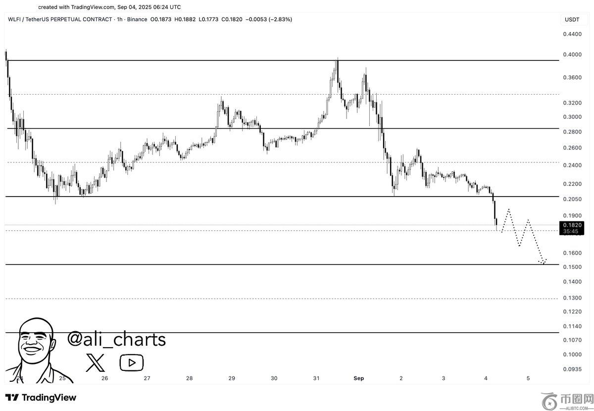 “World Liberty Financial WLFI 失去了 0.20 美元的支撑位!现在,支撑位在 0.15 美元和 0.10 美元。”