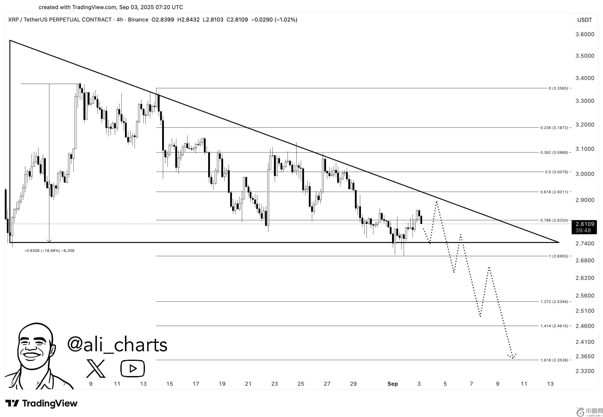 用支付山寨币总结他的分析XRP马丁内斯表示,如果资产失败以 2.74 美元作为支撑,它将跌至 2.35 美元。