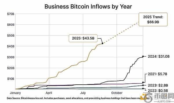 Sam Baker和Vincent Lee指出:“企业已成为比特币持续牛市背后的关键推动力量。2025年前八个月,流入企业资产负债表的比特币资金量已超过2024年全年总额125亿美元。”