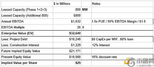 假设预计在2025年第四季度获批的后续800兆瓦电力以行业平均160万美元/兆瓦的价格出租。总计1,600兆瓦将产生约16.3亿美元的年化EBITDA。应用20倍倍数可得出约345亿美元的企业价值。在计入约114.6亿美元的项目级债务与利息后,Helios对应的未来股权价值约为211亿美元。由于我们预计1,600兆瓦容量要到2030年才能**投入运营,我们采用16%的更高折现率以计入额外执行风险。由此得出当前股权价值为100.1亿美元,即每股价值29美元。