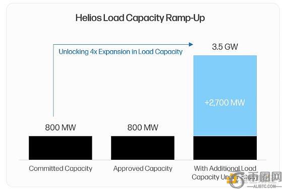 AI数据**行业面临的**制约是电力供应。电力合同是超算服务商争相部署GPU能力的"限制性要素"。Helios拥有与德克萨斯州电力运营商ERCOT签订的800兆瓦获批电力合同,这使得租户能够绕过通常需要36个月以上的新电网接入等待期。此外,该园区具备清晰明确的扩容路径,另有1.7吉瓦容量正处于负荷研究阶段,使初始站点的潜在容量可达2.5吉瓦。2025年第二季度**公告披露,公司已收购相邻土地并提交1吉瓦电网接入申请,将园区总潜在电力容量提升至惊人的3.5吉瓦,跻身全球**数据**站点之列。