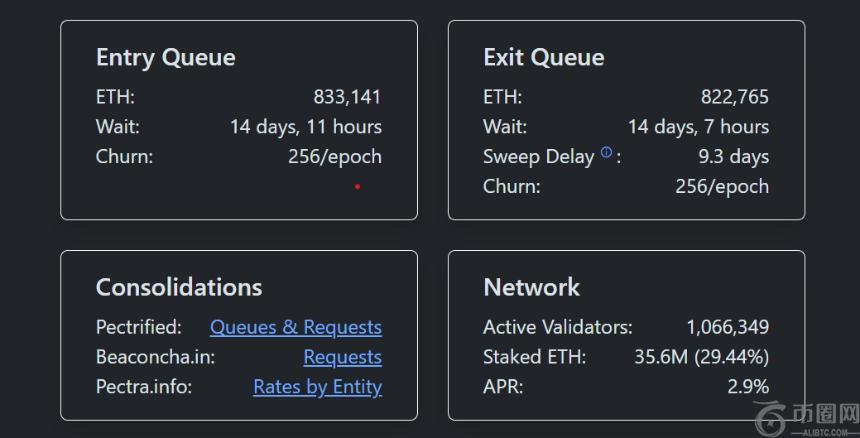 入场队列(代表等待激活质押的**总量)在周二达到了两年来的**点 860,300 ETH。与此同时,管理解除质押率的退出队列已从 8 月 29 日的历史**点 105 万 ETH 下降至周四的 822,700 ETH。