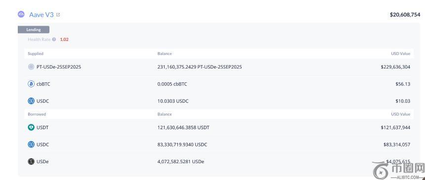 该账户通过**VE生态撬动了约2.3亿美元的PT-USDe资产,借款分配为1.21亿美元USDT、8300万美元USDC和400万美元USDe。根据建仓时的PT-USDe利率(14.7%),以及当前**VE中USDT(6.22%)、USDC(6.06%)和USDe(7.57%)的借款利率,计算得出其杠杆倍数为11.5倍,总收益率为104%。