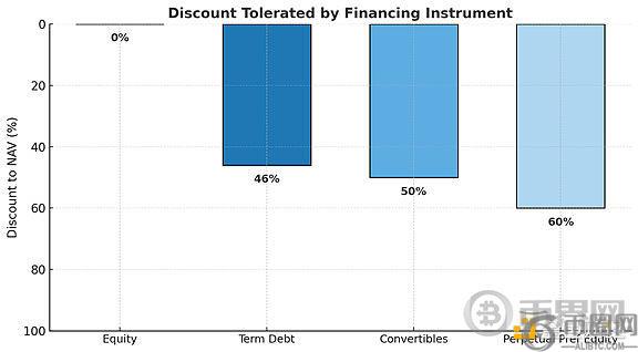 然而在实际操作中,公司可能会考虑发行其他金融工具,比如**性优先股、可转换债券或定期债务,而非出售比特币,以筹集支付票息或本金的资金。这些工具在折价幅度更大时仍能保持价值不被**。但获得资金并非总是有保障的。信贷市场与股票市场看到的信号是一样的。当股票折价交易时,**方可能会要求更高的票息、更严格的契约条款,或者干脆拒绝提供资金。市场知道,不愿出售比特币会增加资金使用的僵化程度,因此可能会对面临**性资本损失风险的资产负债表犹豫不决,不愿提供融资。