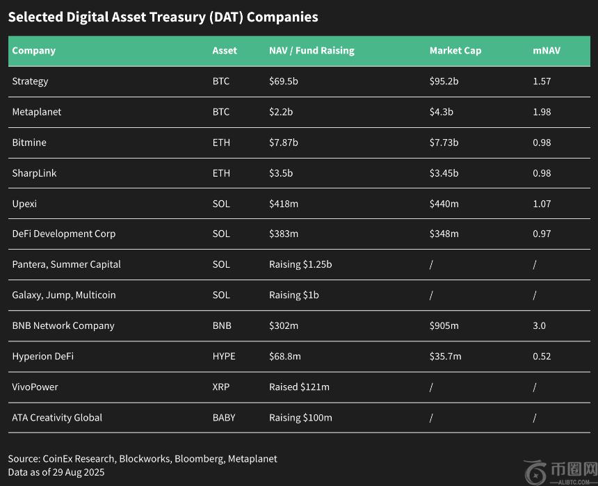 然而,部分DAT的市场净资产价值倍数(mNAV)已从高溢价下降至接近1.0倍,表明随着竞争加剧与情绪回归理性,估值可能面临压力。