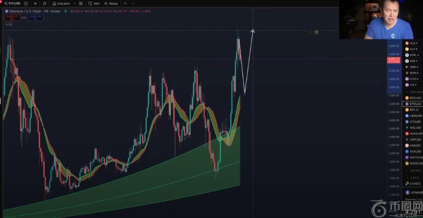 “我想明确一点:我的预期是,以太坊会在触及21周指数移动平均线(EMA)后开始回升。预计这将在九月底或十月初发生。”