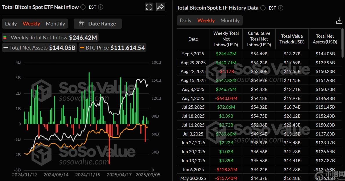 此外,SoSoValue 的数据显示,上周比特币现货交易所交易基金 (ETF) 共录得 2.4642 亿美元的资金流入,连续第二周保持正流入。然而,与 7 月中旬 BTC **突破 12 万美元大关时相比,本周的流入量有所下降。