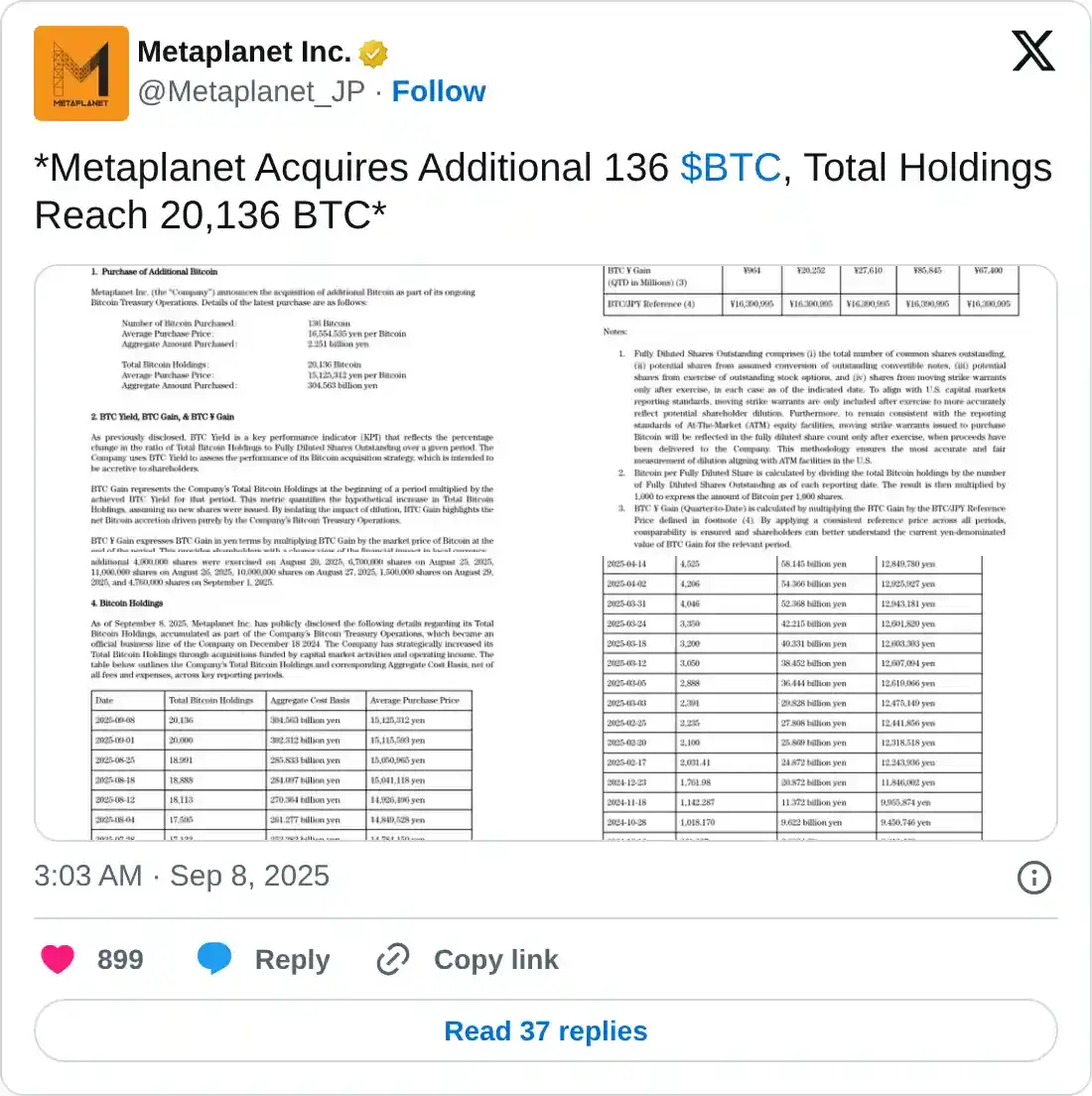 日本投资公司 Metaplanet 又购买了 136 个 BTC,使该公司周一的总持有量达到 20,136 个 BTC。