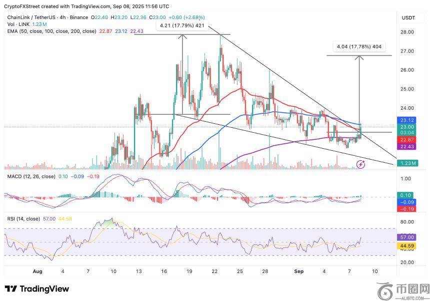 从技术角度来看,Chainlink在4小时图上成功突破了下降楔形形态,价格略高于23.00美元。目前,预言机**位于50周期指数移动平均线(EMA)支撑位22.87美元上方,进一步巩固了其短期看涨结构。