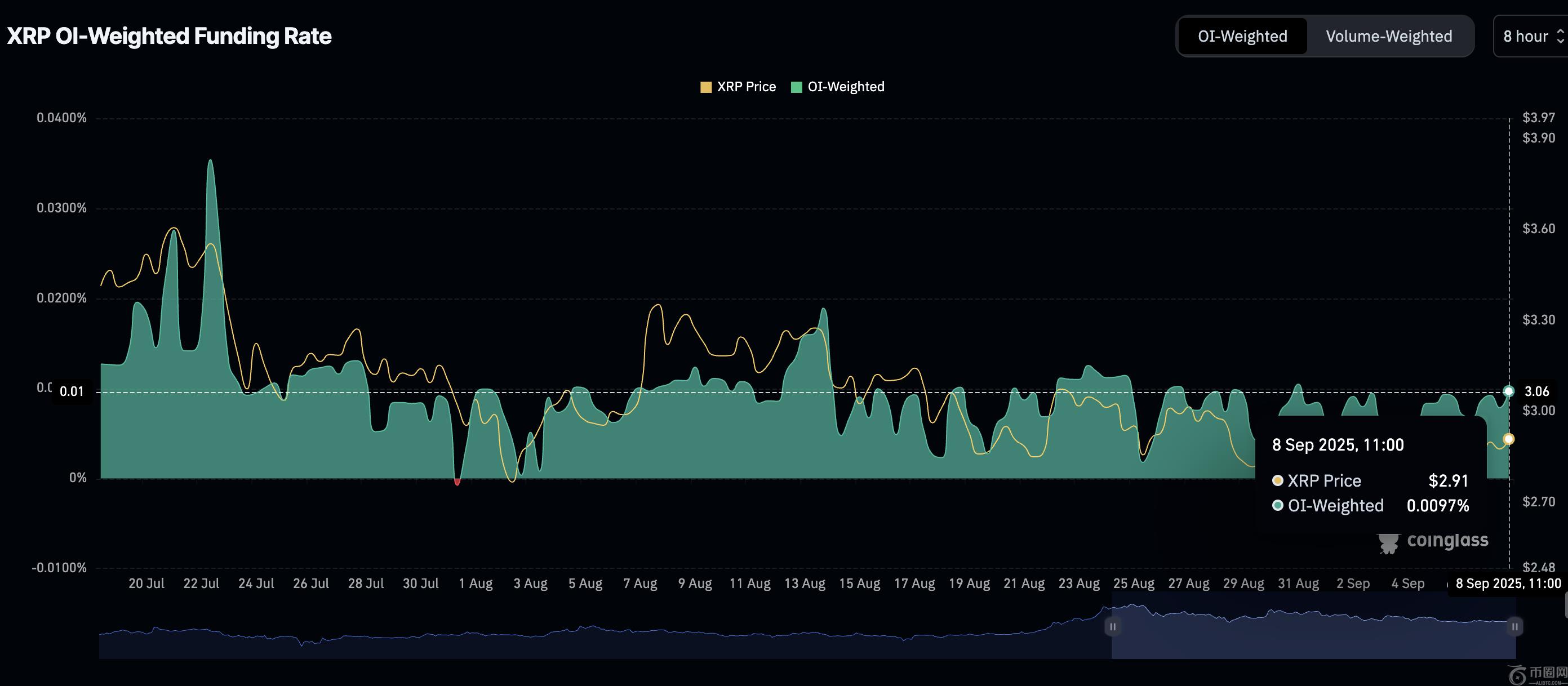 期货融资利率从9月2日的0.0047%稳步上升至本文撰写时的0.0083%,这支撑了XRP衍生品的看涨前景。该指标的稳步上升表明,越来越多的交易者正在利用XRP的多头仓位,从而增强了市场看涨情绪。