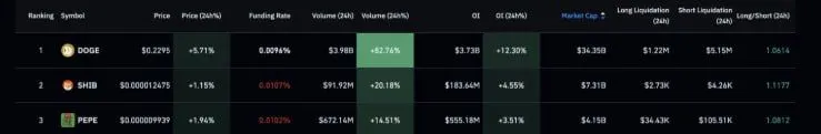 市场信息显示,通过衍生品市场,机构投资者对模因**的吸引力日益增强。狗狗币(DOGE)的未平仓合约上涨了12.3%,SHIB和PEPE的未平仓合约分别上涨了4%和3%。这些资产的交易量均实现了两位数的百分比增长,表明市场参与度有所提升。