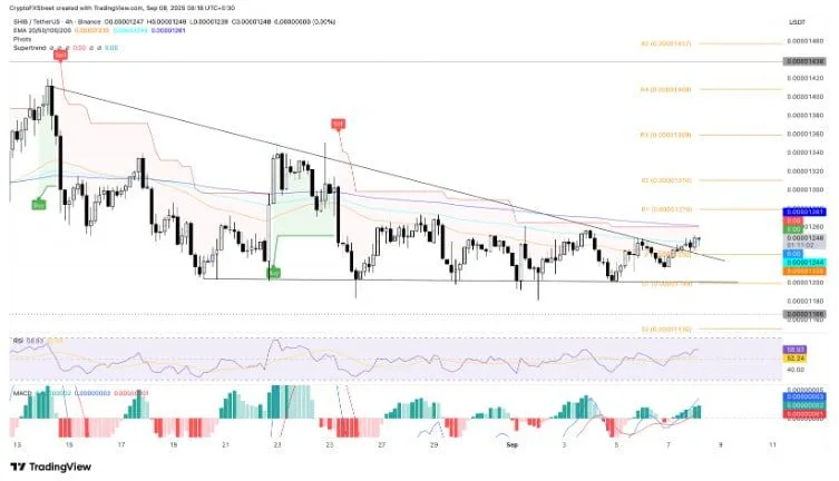 Shiba Inu 在四小时图上突破了多个下跌三角形。该**目前的交易价格高于其 100 周期指数移动平均线,为 0.00001244 美元,标志着趋势可能出现逆转。