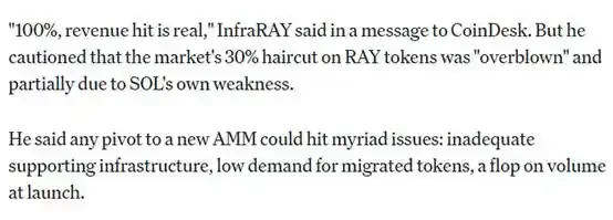 在回复 CoinDesk 时,@0 xINFRA 持续表示对 Raydium 来说分手没那么糟糕,并表达他对 pump.fun 的担忧,「**新的 AMM 都可能遇到无数问题:基础设施不完善、迁移**需求低、交易量下降。」