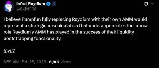 2 月 24 日,Twitter 上有人发现 pump.fun 正在测试自家的 AMM 流动性池。第二天,Raydium 核心贡献者 @0 xINFRA 就发表了一篇长长的推文锐评此事。这篇长推文其实已经带着很浓的火药味,基本上就是在强调是 Raydium 在 pump.fun 的成功中起到了巨大作用、Raydium 在近段数据来看没有那么依赖 pump.fun 等。他最犀利的言辞是下图这段:
