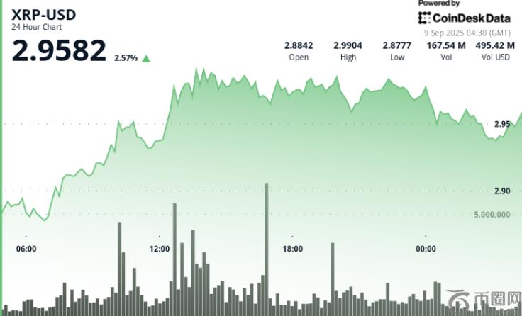 会议从 9 月 8 日 04:00 持续到 9 月 9 日 03:00。 XRP 盘中从 2.89 美元上涨至 2.995 美元( 4%)收盘价为 2.95 美元。 13:00 时交易量飙升至 1.5963 亿,几乎是日均交易量的 3 倍,证实了机构的参与。 支撑位在 2.88 美元至 2.89 美元之间多次维持,而 2.995 美元至 3.00 美元的水平则多次被突破。 **一个小时价格上涨:2.94 美元 → 2.95 美元( 0.34%)成交量为 1.6M,低点较高,显示出受控的积累。技术分析