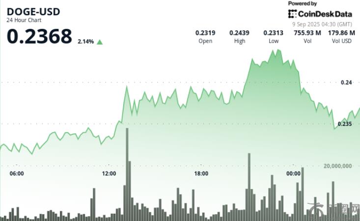 • 9 月 8 日 04:00 至 9 月 9 日 03:00,DOGE 交易价格在 0.231 美元至 0.244 美元之间,波动幅度为 5.7%。• 早期势头将价格推至 0.244 美元的峰值,但大量获利了结扭转了涨势,收于 0.236 美元。• 在价格被拒绝至 0.244 美元时,交易量飙升至 4.635 亿个**,表明机构抛售强劲。• 尾盘支撑位出现在 0.234 美元至 0.237 美元之间,交易量为 6.879 亿枚**,表明存在吸筹迹象。• **一小时的复苏使 DOGE 从 0.234 美元升至 0.237 美元( 1.3%)平均每分钟传输量为 6.2M。