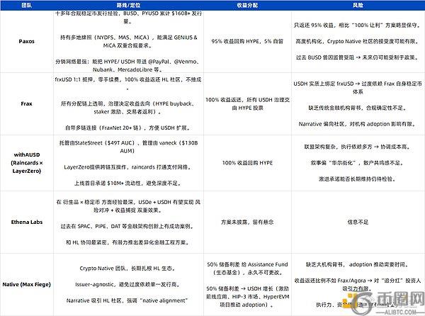 Frax Finance:DeFi派的激进代表。**方案提出将USDH的治理权**交由HYPE社区投票决定,所有底层收益100%返还,不留**利润,**实现社区化。