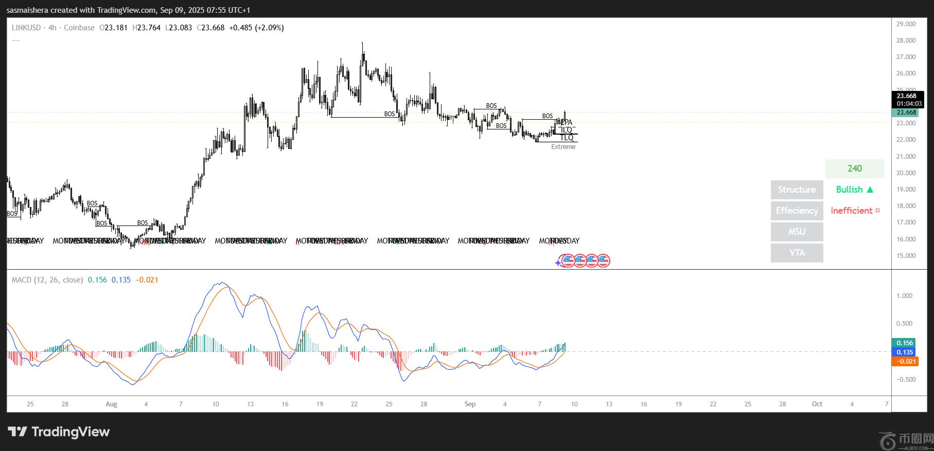 LINK/USD 4 小时图看涨,但缺乏有效性,因为山寨币自本周初以来一直在上涨。LINK 目前交易价格高于 23 美元,目前正瞄准近期高点。