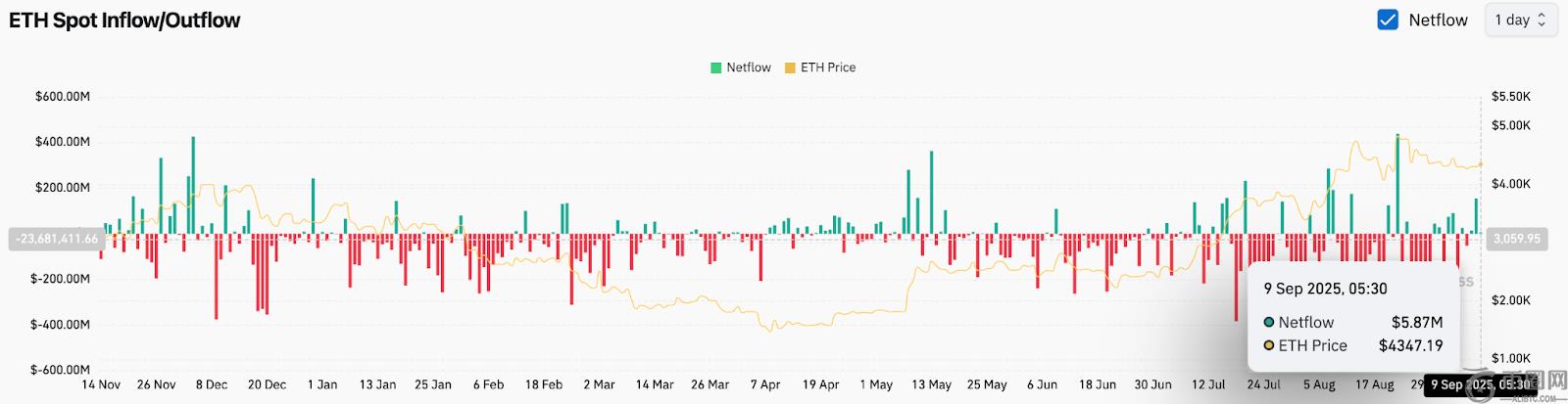 现货资金流数据进一步印证了这种看涨趋势。9月9日,交易所录得587万美元净流入,这是继8月底一系列持续资金流出之后的逆转。