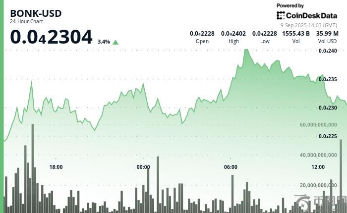 BONK 在过去 24 小时内上涨超过 9%,从 0.000022 美元上涨至 0.000024 美元的峰值.