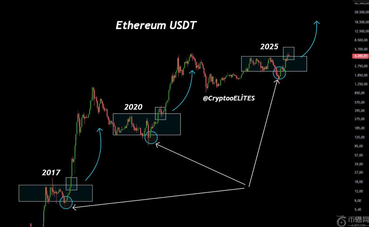 Crypto Gems 的一张图表显示,以太坊正在重复 2017 年和 2020 年出现的熟悉周期——先是长期积累阶段,随后是爆发式上涨。根据该模型,当前的盘整可能是 ETH 开始向 10,000 美元发起冲击前的**一次停顿,分析师表示,这一里程碑可能“比你想象的更快”到来。