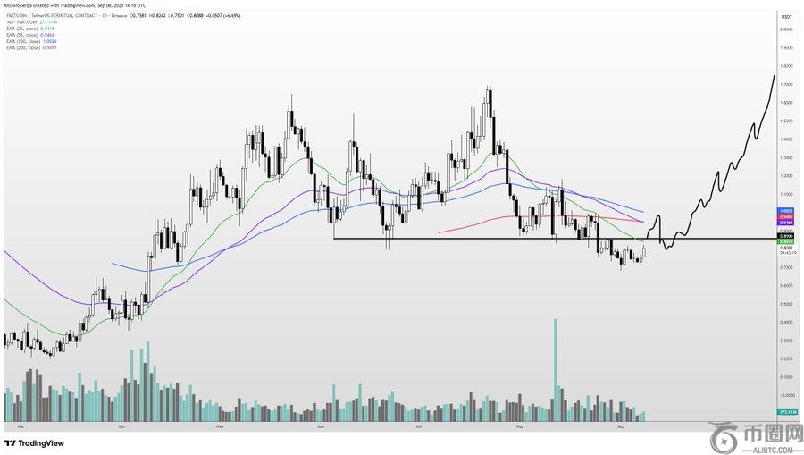 该分析师还预测FARTCOIN 将一路上涨至 10 美元。截至本文撰写时,该 memecoin 的交易价格为 0.805 美元,当日下跌 1.5%。如果涨至 10 美元,则意味着涨幅达到 1,150%。